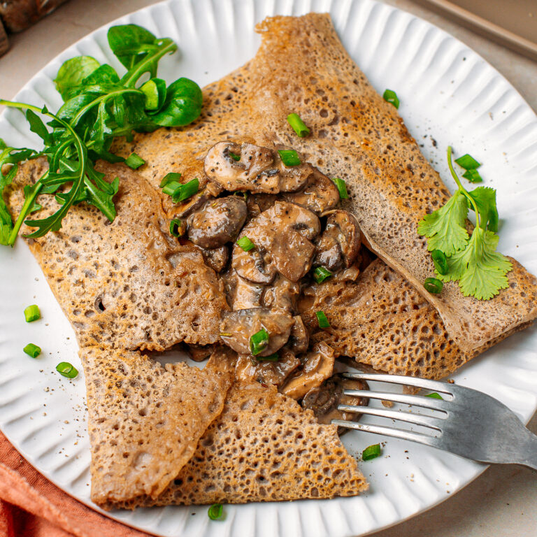 These French-inspired savory buckwheat crêpes are thin, crispy, and perfect for a simple, comforting dinner. Inside, you’ll find garlicky, rosemary-infused sautéed mushrooms made extra creamy with a generous dollop of hummus!