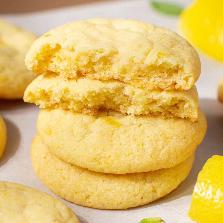 These vegan lemon cookies have a chewy center, crispy edges, and are packed with a bright lemon flavor from both the zest and the juice. No eggs, no dairy, and no lemon extract needed. You’ll just need 8 simple ingredients and about 15 minutes of active time!