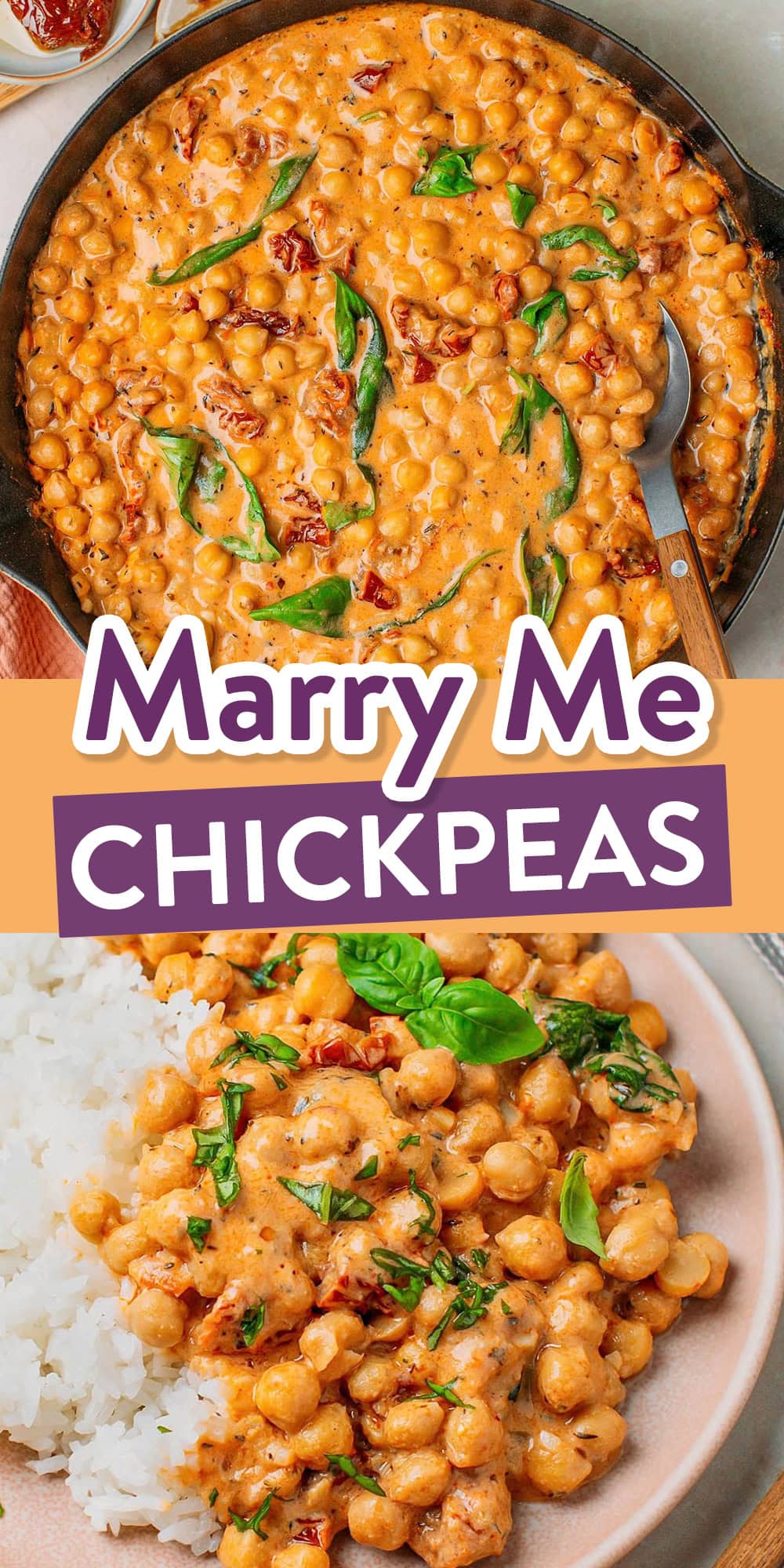 Ultra-creamy, garlicky, and packed with sun-dried tomatoes, my Marry Me Chickpeas are a vegan spin on the popular “Marry Me Chicken”. Made in one pot under 30 minutes, this rich Tuscan-style dish makes a great family dinner. Serve it over pasta, rice, or with crusty bread!