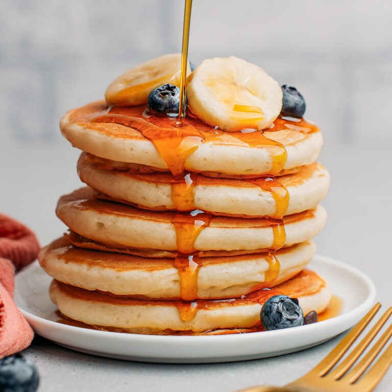 Pancakes are actually my second-favorite breakfast (right after oatmeal), so I have tested more versions than I can count. Over the years, I have made little tweaks here and there until I finally came up with a foolproof recipe that yields fluffy pancakes every single time.