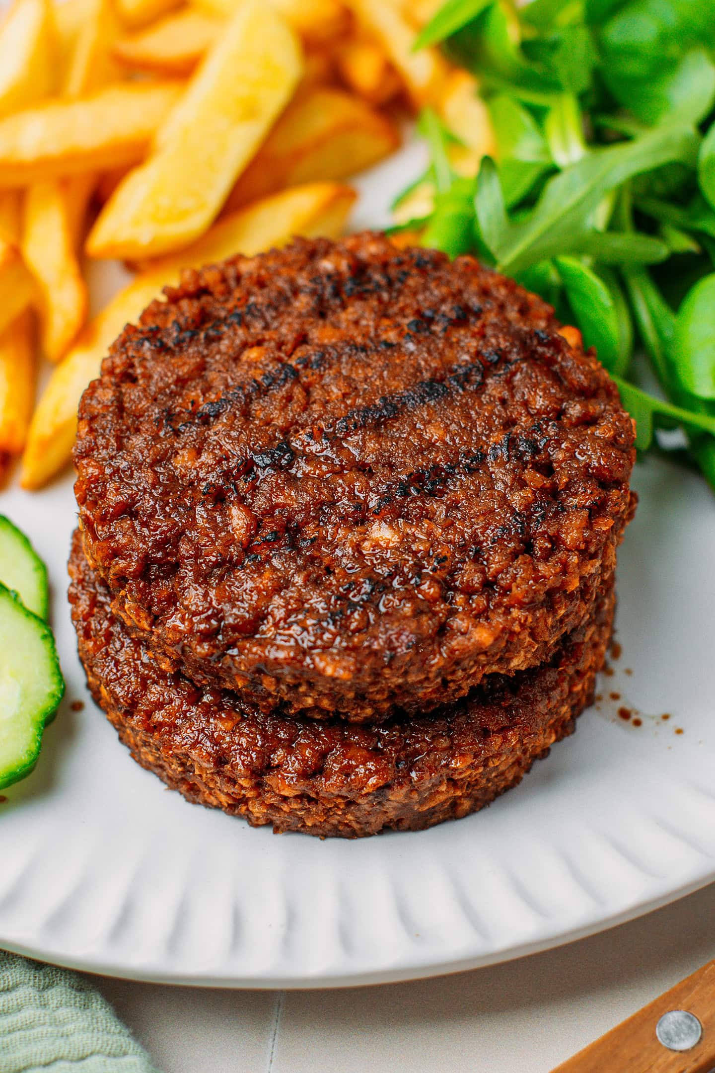 - In burgers: Layer one or two grilled patties with chopped lettuce, burger sauce, cucumber pickles, vegan cheese, and sliced cucumber in soft hamburger buns.