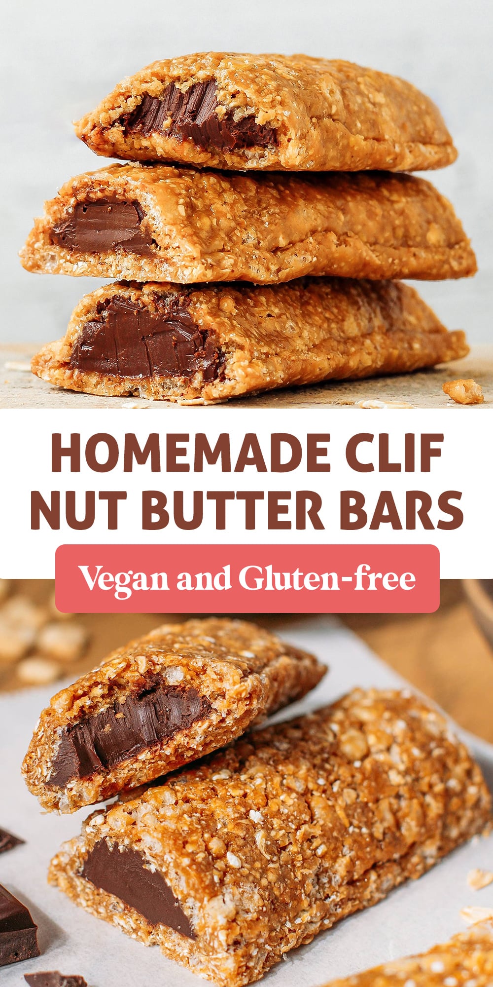 These chocolate hazelnut butter granola bars are a homemade take on Clif Nut Butter Bars, and they taste even better! Soft, chewy, and filled with a creamy nut butter center. They hold together perfectly, are naturally gluten-free, and make the perfect portable snack for your next hike!