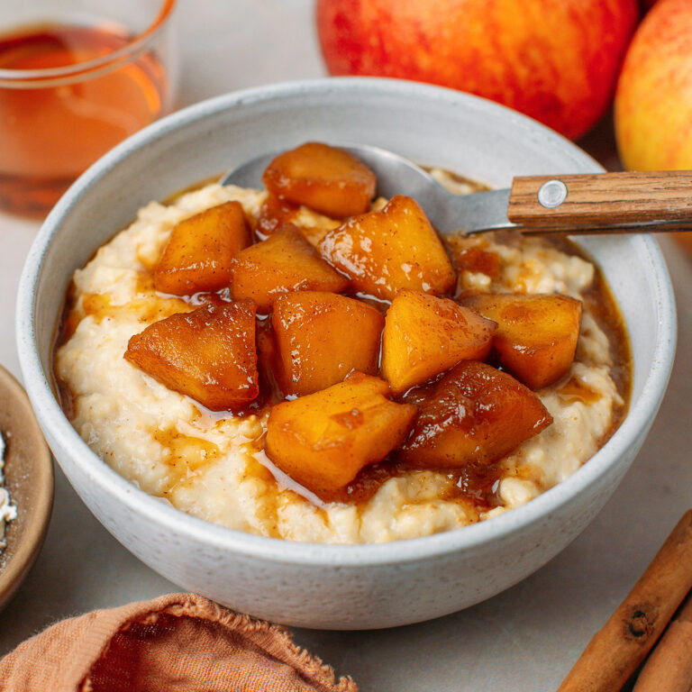 Introducing my go-to breakfast during the colder days: apple oatmeal! But not any oatmeal, one that comes with slightly caramelized apples that are cinnamony, buttery, and oh-so-gooey. The oatmeal itself is not left behind, being naturally sweetened with applesauce and a generous pinch of cinnamon. I’ve made this recipe over and over again over the years, and it never disappoints!