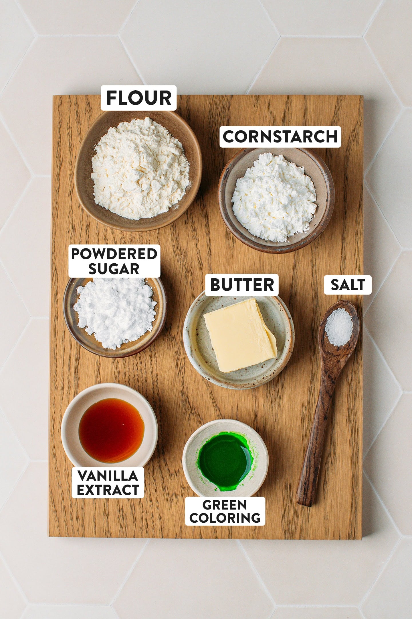 - Prepare the green dough. Add the flour, cornstarch, powdered sugar, salt, and butter to a stand mixer. Using the paddle attachment, mix on speed 2-3 until it forms a fine sandy texture. Then, add the water and green food coloring and mix for about 1 minute, or until a thick cookie dough forms. Wrap the dough in plastic wrap and set aside.