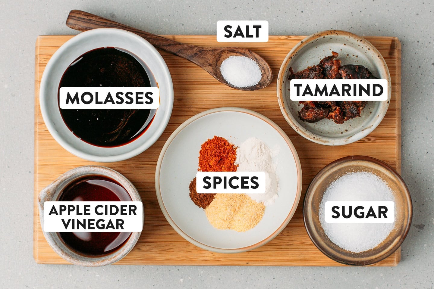 - Combine all of the ingredients. Add the tamarind juice, apple cider vinegar, sugar, molasses, garlic powder, onion powder, chili powder, ground cloves, and salt to a saucepan.