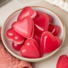 These gelatin-free Valentine's Day gummy hearts are perfectly chewy, bouncy, and so cute! Infused with raspberry syrup, these little gummies are fruity with a hint of coconut flavor. Gift them to your sweetheart or make them together!