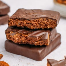 These homemade vegan chocolate-coated protein bars taste just like candy bars! They have a chewy, cookie-dough-like center and a thin chocolate shell that gives you a satisfying snap with each bite. Easy to make, they make the ultimate high-protein snack. Plus, they keep for weeks at room temperature, no refrigeration needed!